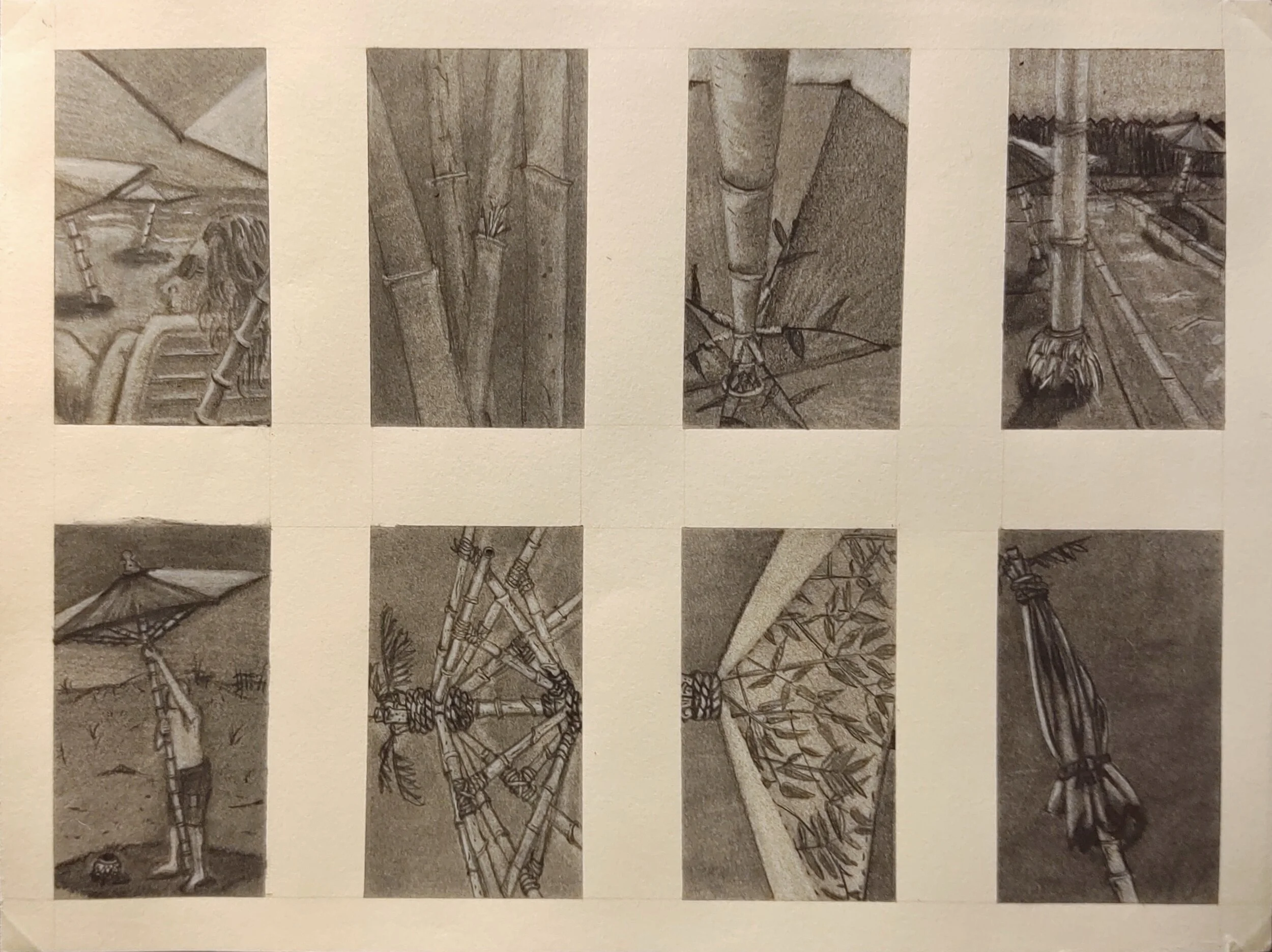 Themed Faux Bamboo Umbrella Concept ArtBlue Sky Thumbnail Sketches For White Sword ThemingGraphite and Charcoal on Paper2020